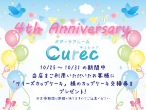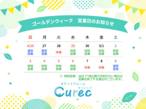 整体・リラクゼーションのCurecは毎週火曜日を定休日とさせていただきます。