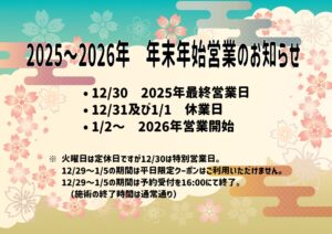 休業日はこちらのカレンダー(赤い日付が休業日)や予約システム内でご確認ください。